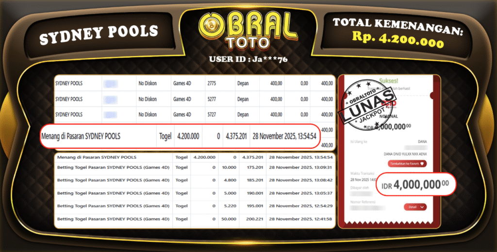 OBRALTOTO – Selamat Kepada Pemenang User ID : Pa***321j JP SYDNEY POOLS Rp,4.200.000 28 November 2025 Situs...