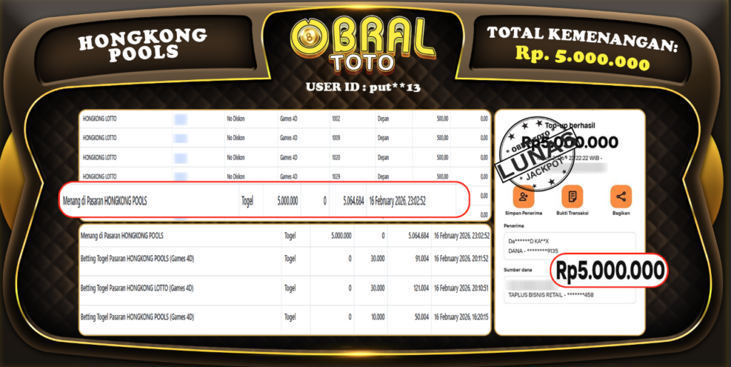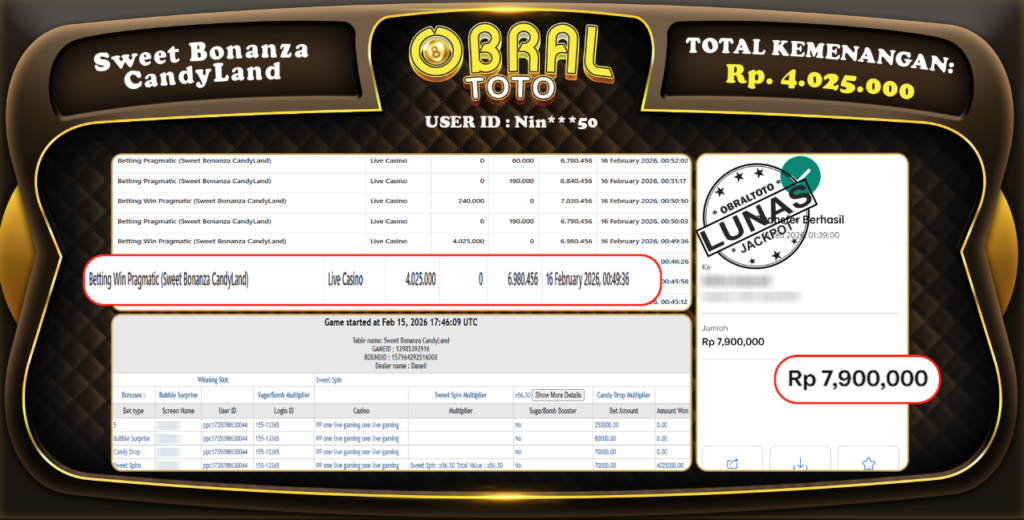 OBRAL4D – Selamat Kepada Pemenang User id : Nin***50 JP SWEET BONANZA CANDYLAND Rp,4.025.000 17 FEBRUARY 2026...