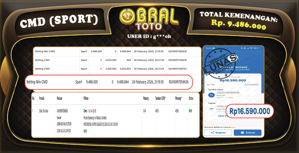 OBRALTOTO – Selamat Kepada Pemenang User ID : g***eh JP CMD ( SPORT) Rp,9.486.000 JUTA 27 FEBRUARY...