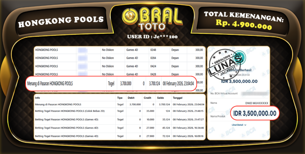 OBRALTOTO – Selamat Kepada Pemenang User ID : bolxxx04 JP HONGKONG POOLS Rp,4.000.000 007 FEBRUARY 2026 Situs...