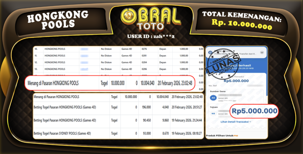 OBRALTOTO – Selamat Kepada Pemenang User ID : ZAH***2 JP HONGKONG POOLS Rp,10.000.000 JUTA 21 FEBRUARY 2026...