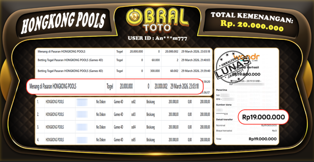 OBRALTOTO – Selamat Kepada Pemenang User ID : AN***M777 JP HONGKONG POOLS Rp 20,000,000 juta 30 MARET...