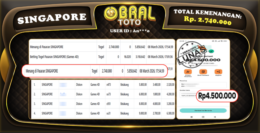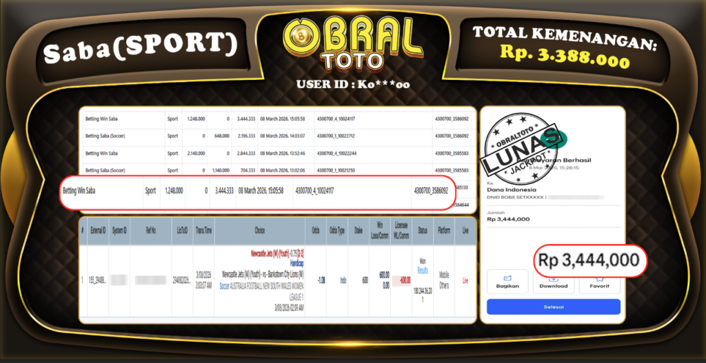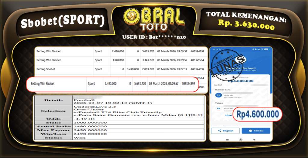 OBRAL4D – Selamat Kepada Pemenang User id : Ko***oo JP SABA SPORT Rp,3,388,000,- 09 Maret 2026 –...