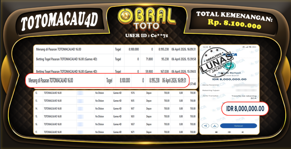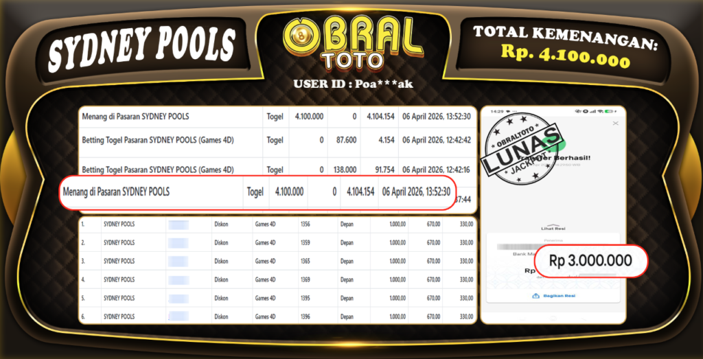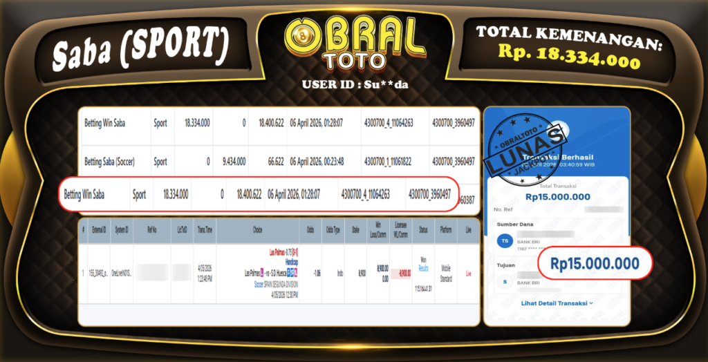 OBRALTOTO – Selamat Kepada Pemenang User id : Su**da OBRALTOTO- JP SABA SPORT Rp, 18.334.000,- 07 APRIL...