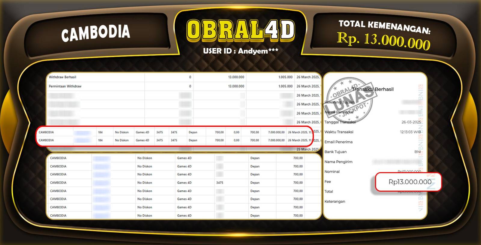 Kami merayakan selamat kepada salah satu pemain CAMBODIA setia situs OBRAL4D yang berhasil meraih kemenangan besar senilai Rp 13.000.000 dalam permainan pada tanggal 27 MARET 2025. Kemenangan ini telah kami proses dan pemahaman secara LUNAS ke rekening yang terdaftar. Semoga kemenangan ini menjadi motivasi bagi pemain lainnya untuk terus mencoba keberuntungan dan menikmati permainan di OBRAL4D.