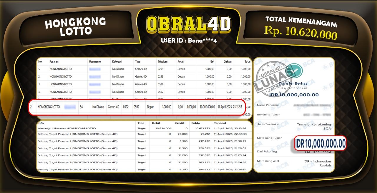 Bukti pembayaran lunas yang ditampilkan merupakan salah satu indikator bahwa situs OBRAL4D adalah platform slot, togel, & casino yang sangat aman dan terpercaya. Dengan komitmen untuk membayar berapapun kemenangan yang diraih oleh para pemain, OBRAL4D memastikan pengalaman bermain yang transparan dan memuaskan. Kepercayaan dan kenyamanan pemain adalah prioritas utama, sehingga setiap kemenangan Anda akan selalu dihargai dan dijamin secara penuh tanpa kendala.