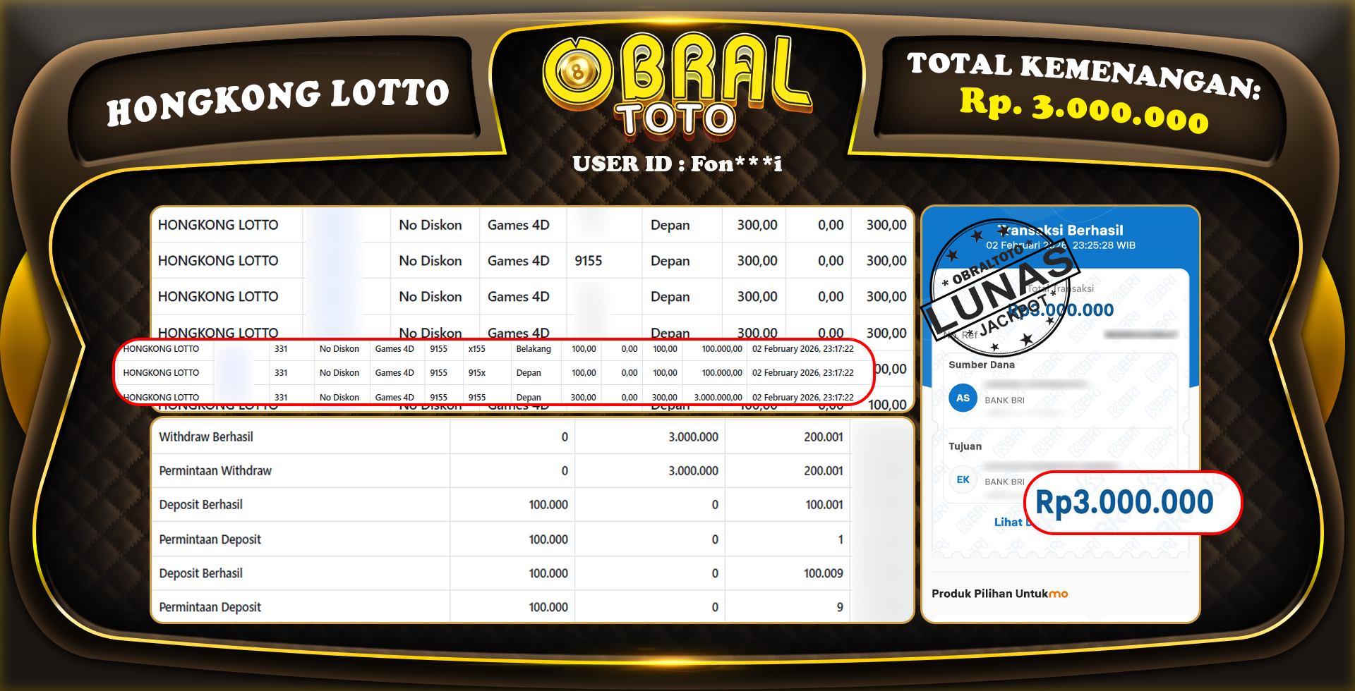 Kami merayakan selamat kepada salah satu pemain setia situs OBRAL4D yang berhasil meraih kemenangan besar senilai Rp,3.000.000.- dalam permainan HONGKONG LOTTO pada tanggal 3 February 2026 Kemenangan ini telah kami proses dan pemahaman secara LUNAS ke rekening yang terdaftar. Semoga kemenangan ini menjadi motivasi bagi pemain lainnya untuk terus mencoba keberuntungan dan menikmati permainan di OBRAL4D.