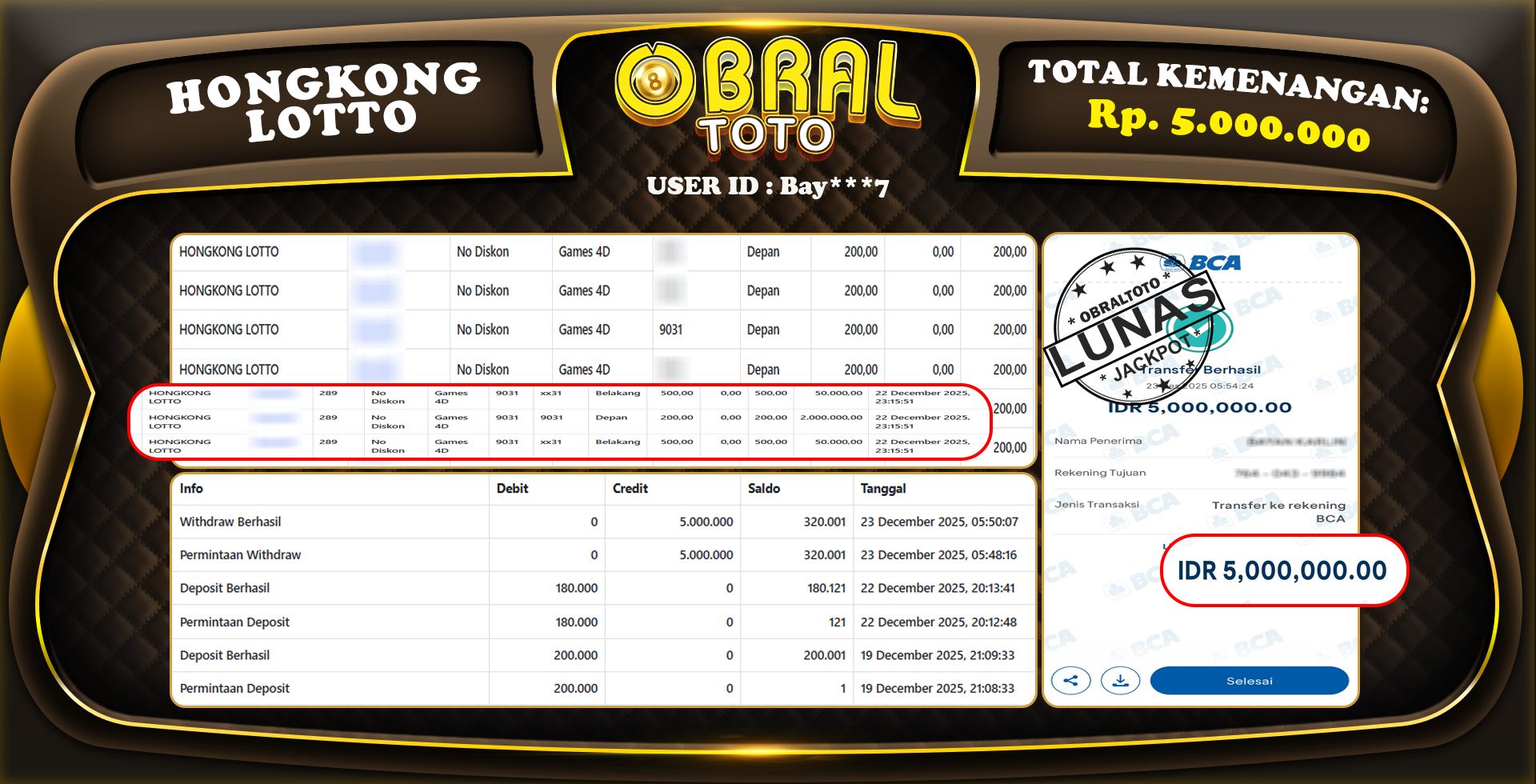 OBRAL4D – Selamat Kepada Pemenang User id :Bay****7 JP HONGKONG LOTTO Rp,5.000.000.-23 DESEMBER 2025- Situs game online terpercaya dengan bukti jp yang telah resmi dan terjamin di Indonesia, memberikan pengalaman bermain yang aman dan menyenangkan bagi para penggemar game online. Dengan hadirnya OBRAL4D , pemain dapat menikmati kemudahan akses ke berbagai permainan seru, peluang memenangkan hadiah besar, serta keuntungan menarik yang telah disiapkan khusus untuk para member lama maupun member baru. Platform ini dirancang untuk memberikan kenyamanan dan keamanan, sehingga setiap pemain dapat fokus menikmati permainan sekaligus meraih keuntungan maksimal.