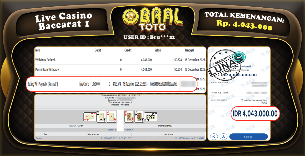 OBRAL4D – Selamat Kepada Pemenang User id : Bru***21 JP LIVE CASINO BACCARAT,1 Rp,4.043.000,-17 DECEMBER 2025- Situs game online terpercaya dengan bukti jp yang telah resmi dan terjamin di Indonesia, memberikan pengalaman bermain yang aman dan menyenangkan bagi para penggemar game online. Dengan hadirnya OBRAL4D , pemain dapat menikmati kemudahan akses ke berbagai permainan seru, peluang memenangkan hadiah besar, serta keuntungan menarik yang telah disiapkan khusus untuk para member lama maupun member baru. Platform ini dirancang untuk memberikan kenyamanan dan keamanan, sehingga setiap pemain dapat fokus menikmati permainan sekaligus meraih keuntungan maksimal.