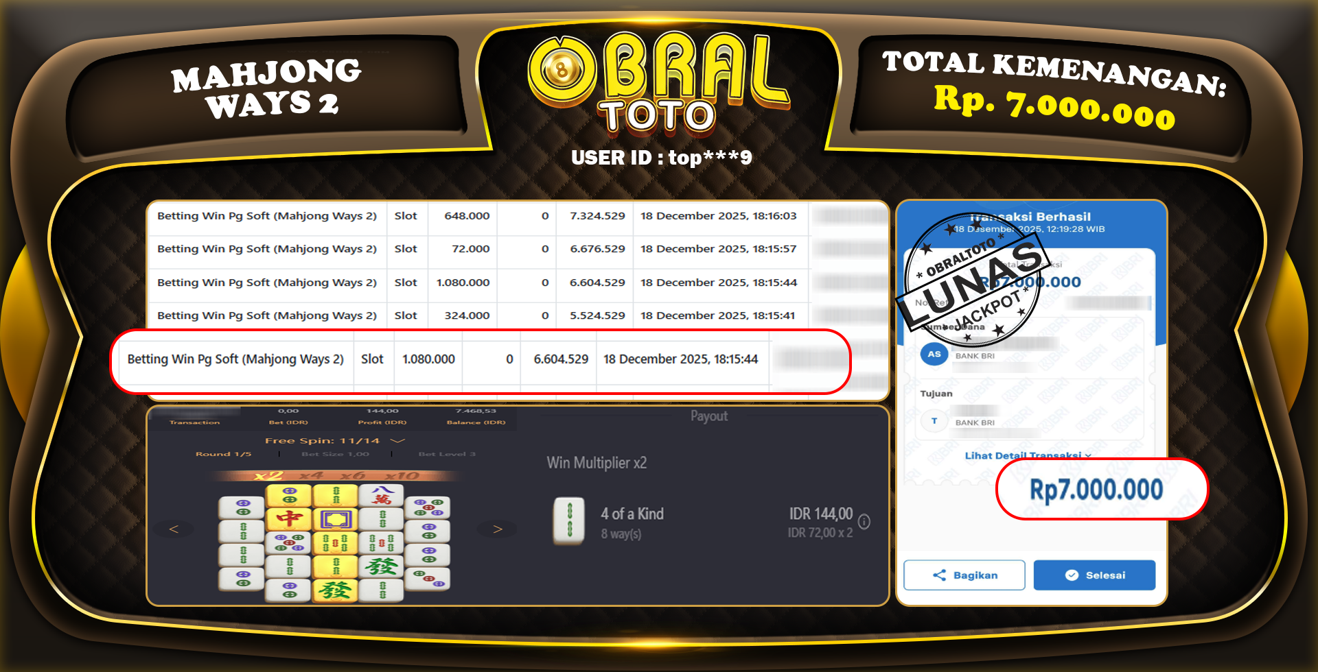 Kami merayakan selamat kepada salah satu pemain setia situs OBRAL4D yang berhasil meraih kemenangan besar senilai Rp 7.000.000  dalam permainan SLOT MAHJONG WAYS 2 pada tanggal 20 DESEMBER 2025. Kemenangan ini telah kami proses dan pemahaman secara LUNAS ke rekening yang terdaftar. Semoga kemenangan ini menjadi motivasi bagi pemain lainnya untuk terus mencoba keberuntungan dan menikmati permainan di OBRAL4D.