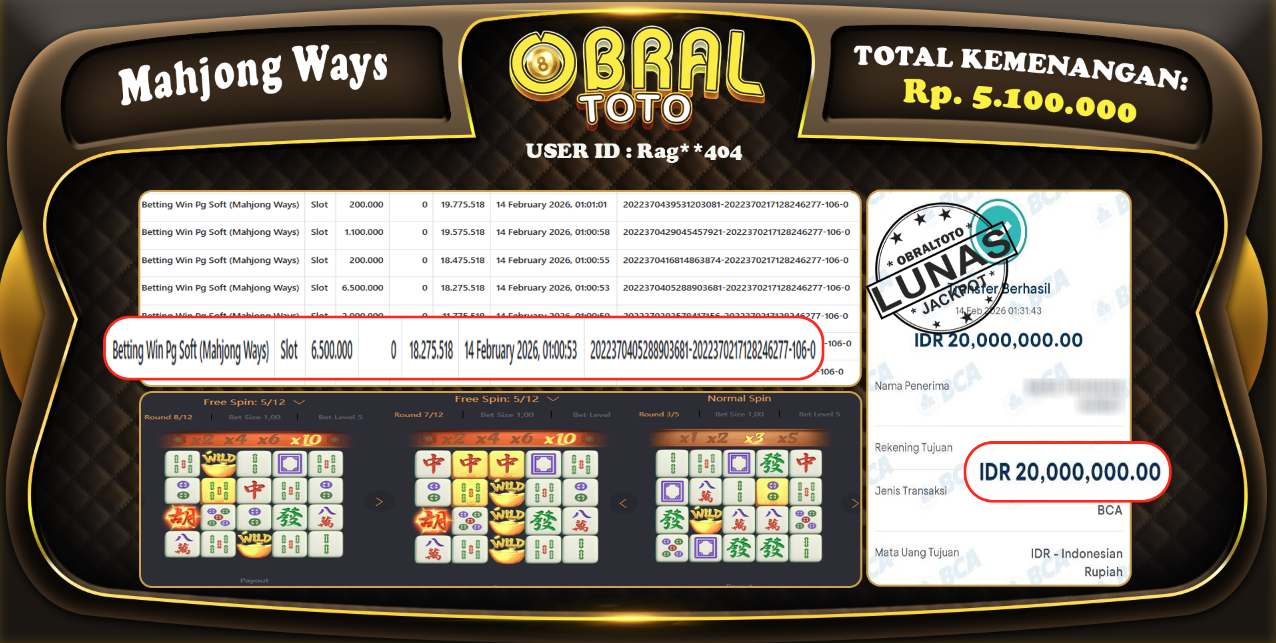 Kami merayakan selamat kepada salah satu pemain setia situs OBRAL4D yang berhasil meraih kemenangan besar senilai Rp Rp 5.100.000 dalam permainan SLOT MAHJONG WAYS  pada tanggal 14 February 2026. Kemenangan ini telah kami proses dan pemahaman secara LUNAS ke rekening yang terdaftar. Semoga kemenangan ini menjadi motivasi bagi pemain lainnya untuk terus mencoba keberuntungan dan menikmati permainan di OBRAL4D.