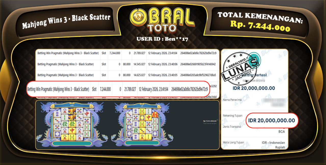 Kami merayakan selamat kepada salah satu pemain setia situs OBRAL4D yang berhasil meraih kemenangan besar senilai Rp,7.244.000,-dalam permainan SLOT MAHJONG WINS 3 BLACK SCATTER pada tanggal 14 February 2026. Kemenangan ini telah kami proses dan pemahaman secara LUNAS ke rekening yang terdaftar. Semoga kemenangan ini menjadi motivasi bagi pemain lainnya untuk terus mencoba keberuntungan dan menikmati permainan di OBRAL4D.