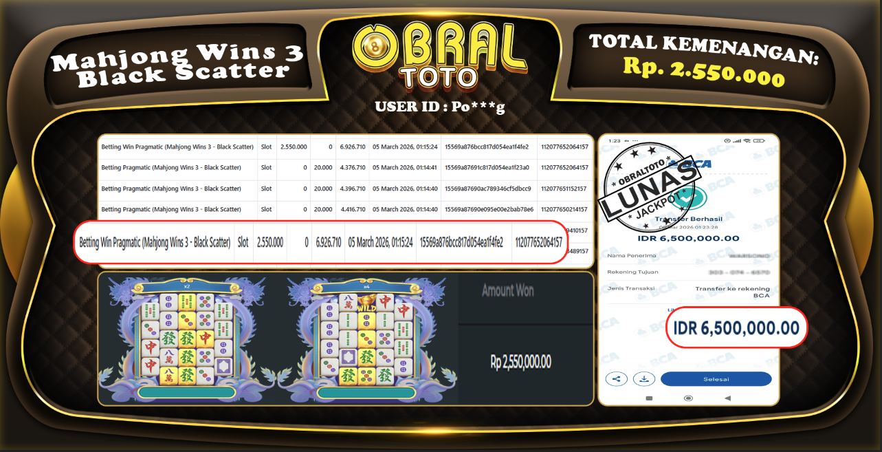 OBRAL4D – Selamat Kepada Pemenang User id : Pu***g JP MAHJONG Wins 3 Black Scatter Rp 2.550.000 Juta 05 Maret 2026 – Situs game online terpercaya dengan bukti jp yang telah resmi dan terjamin di Indonesia, memberikan pengalaman bermain yang aman dan menyenangkan bagi para penggemar game online. Dengan hadirnya OBRAL4D , pemain dapat menikmati kemudahan akses ke berbagai permainan seru, peluang memenangkan hadiah besar, serta keuntungan menarik yang telah disiapkan khusus untuk para member lama maupun member baru. Platform ini dirancang untuk memberikan kenyamanan dan keamanan, sehingga setiap pemain dapat fokus menikmati permainan sekaligus meraih keuntungan maksimal.