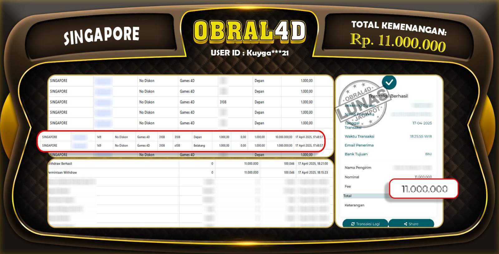 Kami merayakan selamat kepada salah satu pemain setia situs OBRAL4D yang berhasil meraih kemenangan besar senilai Rp 11.000.000 dalam permainan SINGAPORE pada tanggal 17 April 2025. Kemenangan ini telah kami proses dan pemahaman secara LUNAS ke rekening yang terdaftar. Semoga kemenangan ini menjadi motivasi bagi pemain lainnya untuk terus mencoba keberuntungan dan menikmati permainan di OBRAL4D.