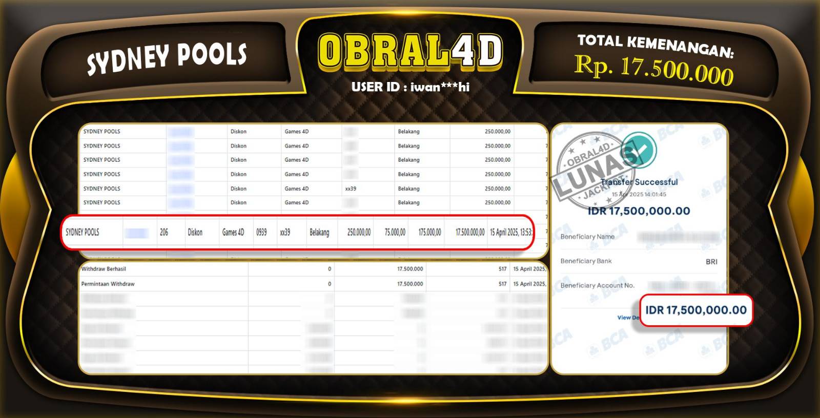 Kami merayakan selamat kepada salah satu pemain setia situs OBRAL4D yang berhasil meraih kemenangan besar senilai Rp,17.500.000 dalam permainan SYDNEY POOLS pada tanggal 17 April 2025. Kemenangan ini telah kami proses dan pemahaman secara LUNAS ke rekening yang terdaftar. Semoga kemenangan ini menjadi motivasi bagi pemain lainnya untuk terus mencoba keberuntungan dan menikmati permainan di OBRAL4D.