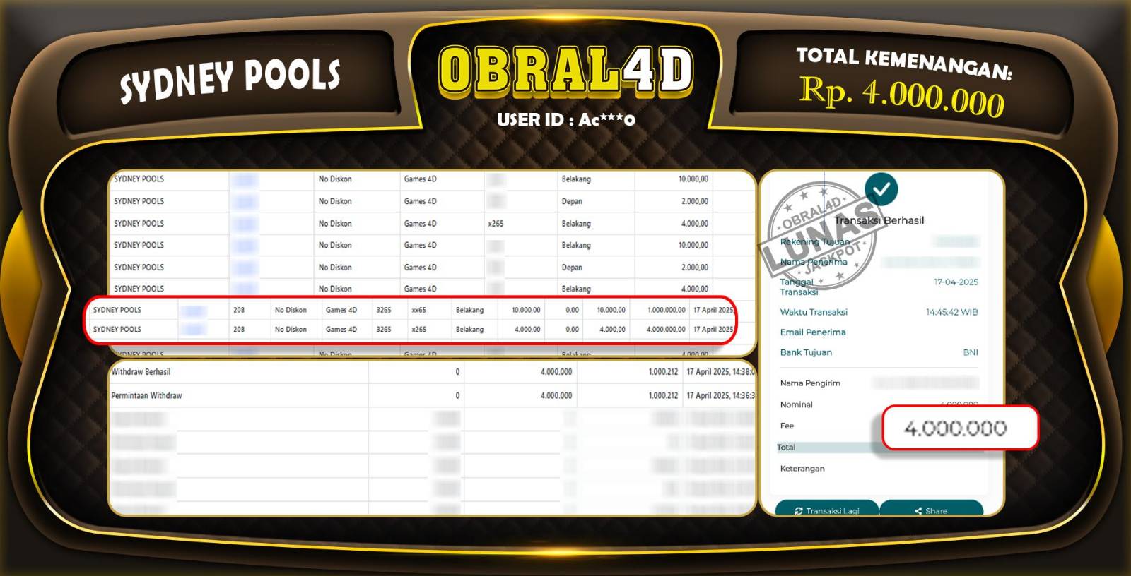 Kami merayakan selamat kepada salah satu pemain setia situs OBRAL4D yang berhasil meraih kemenangan besar senilai Rp,4.000.000 dalam permainan SYDNEY POOLS pada tanggal 17 April 2025. Kemenangan ini telah kami proses dan pemahaman secara LUNAS ke rekening yang terdaftar. Semoga kemenangan ini menjadi motivasi bagi pemain lainnya untuk terus mencoba keberuntungan dan menikmati permainan di OBRAL4D.