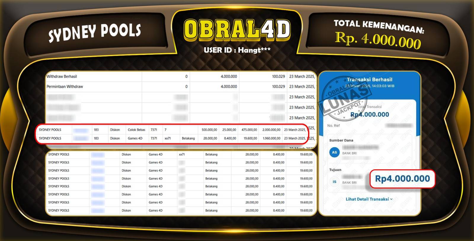 Kami merayakan selamat kepada salah satu pemain setia situs OBRAL4D yang berhasil meraih kemenangan besar senilai Rp,4.000.000 dalam permainan SYDNEY POOLS pada tanggal 23 Maret 2025. Kemenangan ini telah kami proses dan pemahaman secara LUNAS ke rekening yang terdaftar. Semoga kemenangan ini menjadi motivasi bagi pemain lainnya untuk terus mencoba keberuntungan dan menikmati permainan di OBRAL4D.