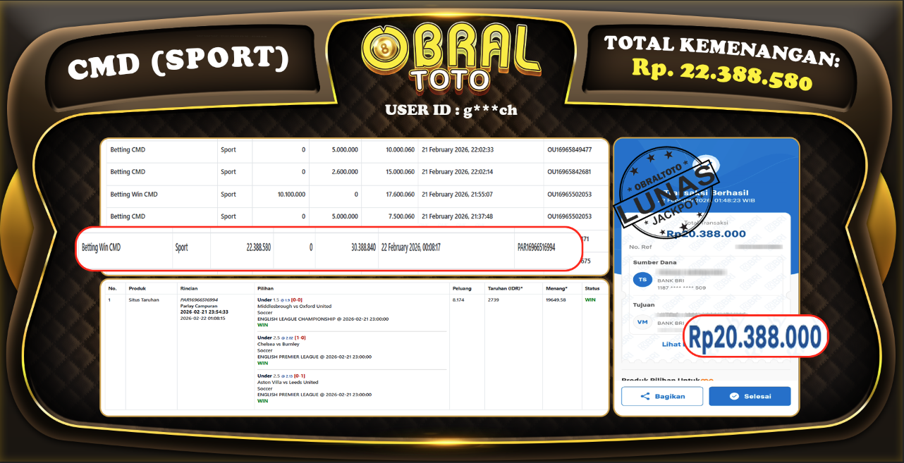 Kami merayakan selamat kepada salah satu pemain setia situs OBRALTOTO yang berhasil meraih kemenangan besar senilai Rp,8.336.000dalam permainan CMD pada tanggal 22 FEBRUARY 2026 . Kemenangan ini telah kami proses dan pemahaman secara LUNAS ke rekening yang terdaftar. Semoga kemenangan ini menjadi motivasi bagi pemain lainnya untuk terus mencoba keberuntungan dan menikmati permainan di OBRALTOTO .
