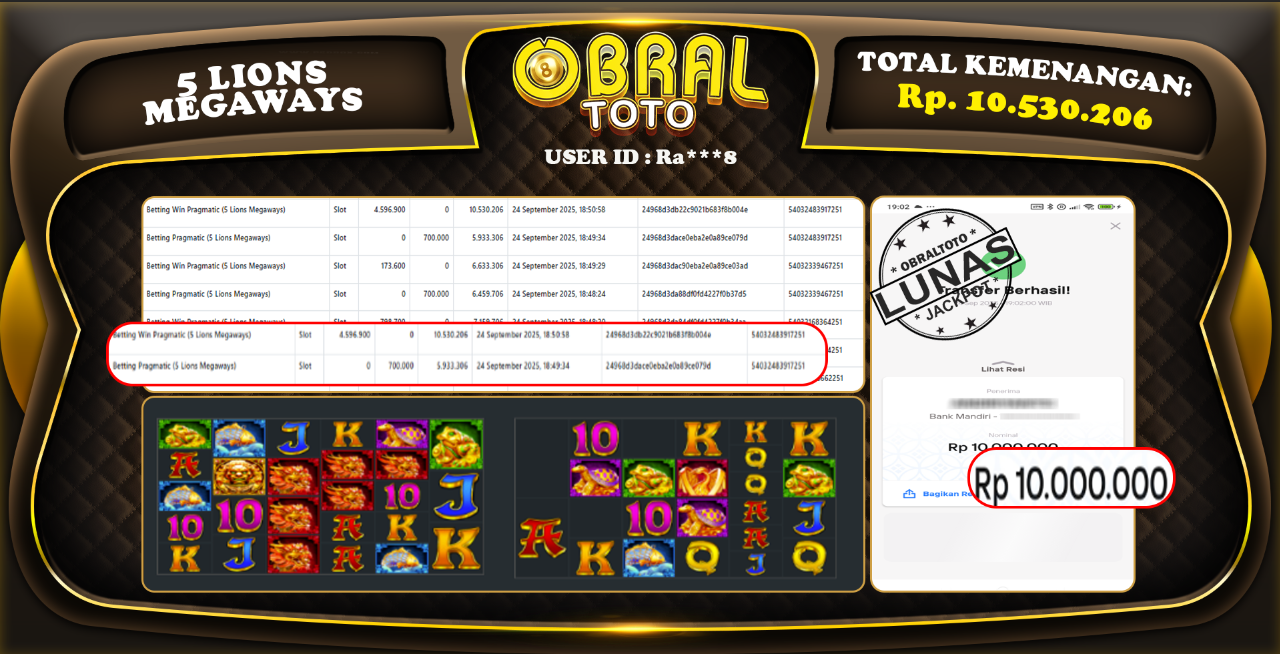 OBRALTOTO – Selamat Kepada Pemenang User id : Ra***8 JP 5 LIONS MEGAWAYS Rp,10.530.206 24 September 2025- Situs game online terpercaya dengan bukti jp yang telah resmi dan terjamin di Indonesia, memberikan pengalaman bermain yang aman dan menyenangkan bagi para penggemar game online. Dengan hadirnya OBRALTOTO , pemain dapat menikmati kemudahan akses ke berbagai permainan seru, peluang memenangkan hadiah besar, serta keuntungan menarik yang telah disiapkan khusus untuk para member lama maupun member baru. Platform ini dirancang untuk memberikan kenyamanan dan keamanan, sehingga setiap pemain dapat fokus menikmati permainan sekaligus meraih keuntungan maksimal.