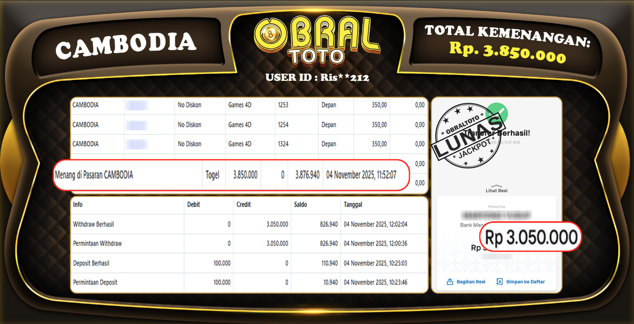 Kami merayakan selamat kepada salah satu pemain setia situs OBRALTOTO yang berhasil meraih kemenangan besar senilai Rp,3.850.000 dalam permainan CAMBODIA pada tanggal 04 November 2025. Kemenangan ini telah kami proses dan pemahaman secara LUNAS ke rekening yang terdaftar. Semoga kemenangan ini menjadi motivasi bagi pemain lainnya untuk terus mencoba keberuntungan dan menikmati permainan di OBRALTOTO .