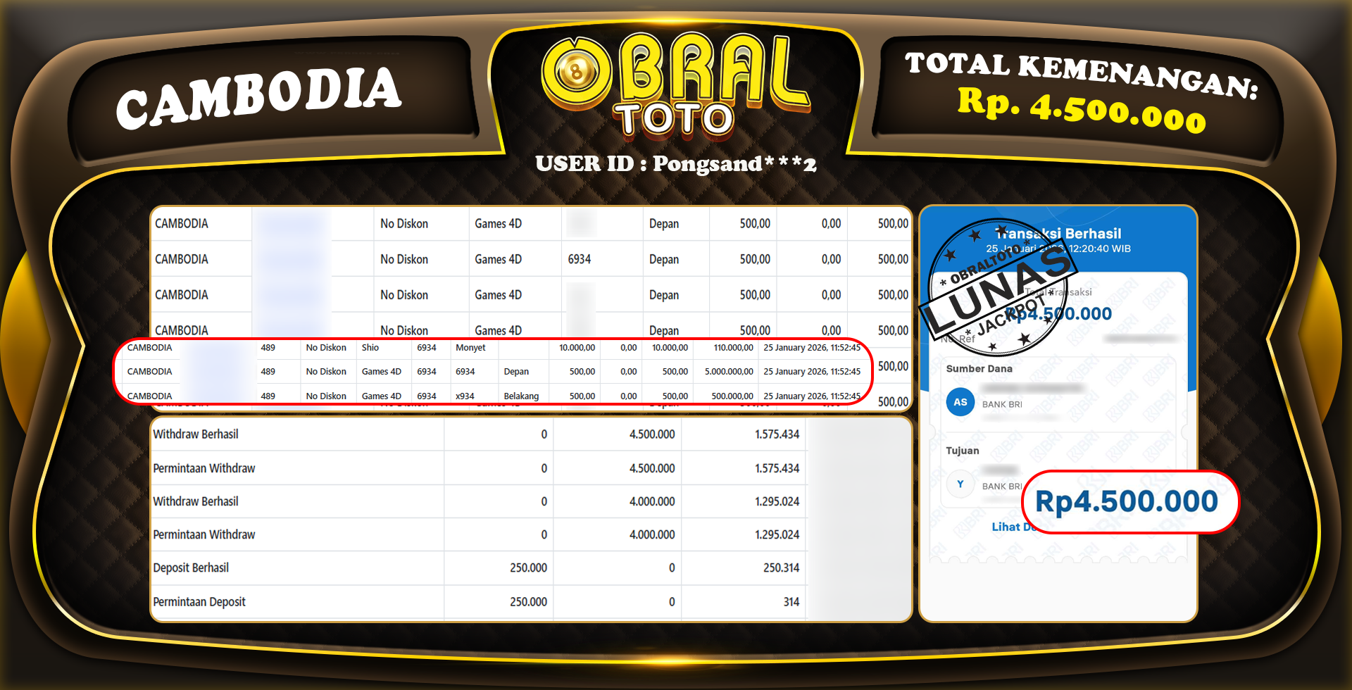 Kami merayakan selamat kepada salah satu pemain setia situs OBRALTOTO yang berhasil meraih kemenangan besar senilai Rp,6.700.000 dalam permainan CAMBODIA pada tanggal 27 JANUARI 2026. Kemenangan ini telah kami proses dan pemahaman secara LUNAS ke rekening yang terdaftar. Semoga kemenangan ini menjadi motivasi bagi pemain lainnya untuk terus mencoba keberuntungan dan menikmati permainan di OBRALTOTO .