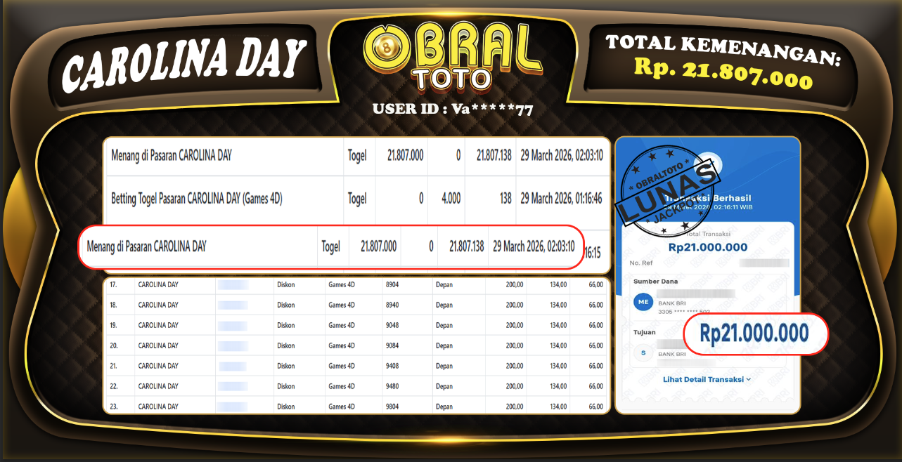 Kami merayakan selamat kepada salah satu pemain setia situs OBRALTOTO yang berhasil meraih kemenangan besar senilai Rp 21,807,000 dalam permainan CAROLINA DAY pada tanggal 30 MARET 2026. Kemenangan ini telah kami proses dan pemahaman secara LUNAS ke rekening yang terdaftar. Semoga kemenangan ini menjadi motivasi bagi pemain lainnya untuk terus mencoba keberuntungan dan menikmati permainan di OBRALTOTO .