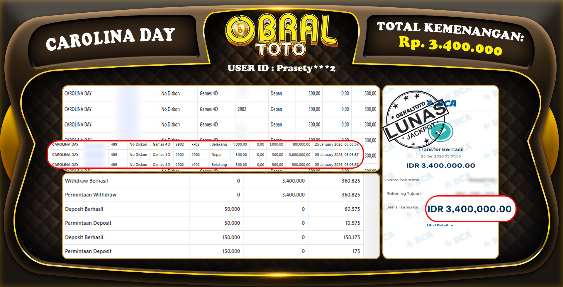 Kami merayakan selamat kepada salah satu pemain setia situs OBRALTOTO yang berhasil meraih kemenangan besar senilai Rp,3.400.000 dalam permainan CAROLINA DAY pada tanggal 25 January 2026. Kemenangan ini telah kami proses dan pemahaman secara LUNAS ke rekening yang terdaftar. Semoga kemenangan ini menjadi motivasi bagi pemain lainnya untuk terus mencoba keberuntungan dan menikmati permainan di OBRALTOTO .