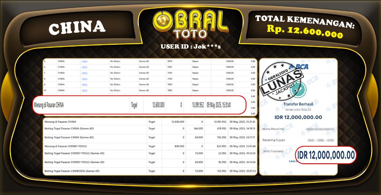 OBRALTOTO – Selamat Kepada Pemenang User id :Jok***s JP CHINA Rp,12.600.000.-09 MEI 2025- Situs game online terpercaya dengan bukti jp yang telah resmi dan terjamin di Indonesia, memberikan pengalaman bermain yang aman dan menyenangkan bagi para penggemar game online. Dengan hadirnya OBRALTOTO , pemain dapat menikmati kemudahan akses ke berbagai permainan seru, peluang memenangkan hadiah besar, serta keuntungan menarik yang telah disiapkan khusus untuk para member lama maupun member baru. Platform ini dirancang untuk memberikan kenyamanan dan keamanan, sehingga setiap pemain dapat fokus menikmati permainan sekaligus meraih keuntungan maksimal.
