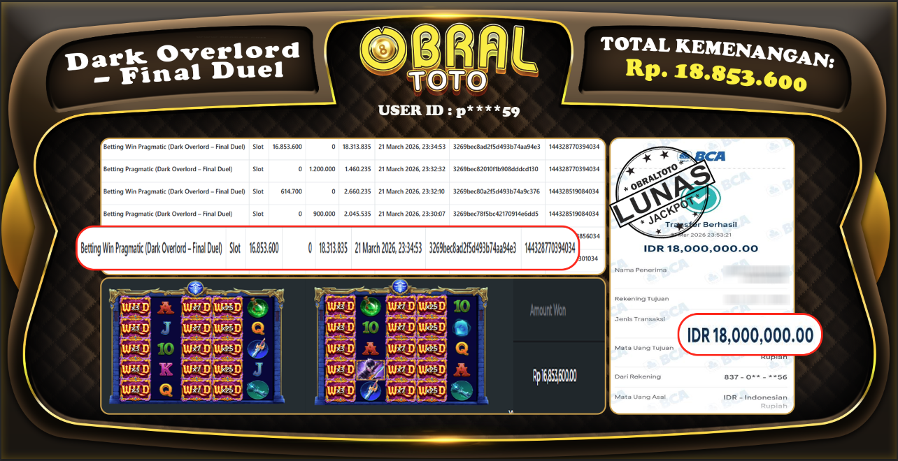 Kami merayakan selamat kepada salah satu pemain setia situs OBRALTOTO yang berhasil meraih kemenangan besar senilai Rp, 18.853.600 dalam permainan Dark Overlord-Final Duel pada tanggal 22 Maret 2026. Kemenangan ini telah kami proses dan pemahaman secara LUNAS ke rekening yang terdaftar. Semoga kemenangan ini menjadi motivasi bagi pemain lainnya untuk terus mencoba keberuntungan dan menikmati permainan di OBRALTOTO .