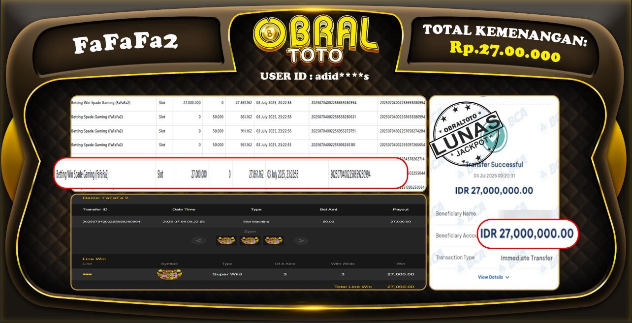 Kami merayakan selamat kepada salah satu pemain setia situs OBRALTOTO yang berhasil meraih kemenangan besar senilai Rp,27.000.00 dalam permainan FAFAFA2 pada tanggal 04 JULI 2025. Kemenangan ini telah kami proses dan pemahaman secara LUNAS ke rekening yang terdaftar. Semoga kemenangan ini menjadi motivasi bagi pemain lainnya untuk terus mencoba keberuntungan dan menikmati permainan di OBRALTOTO .
