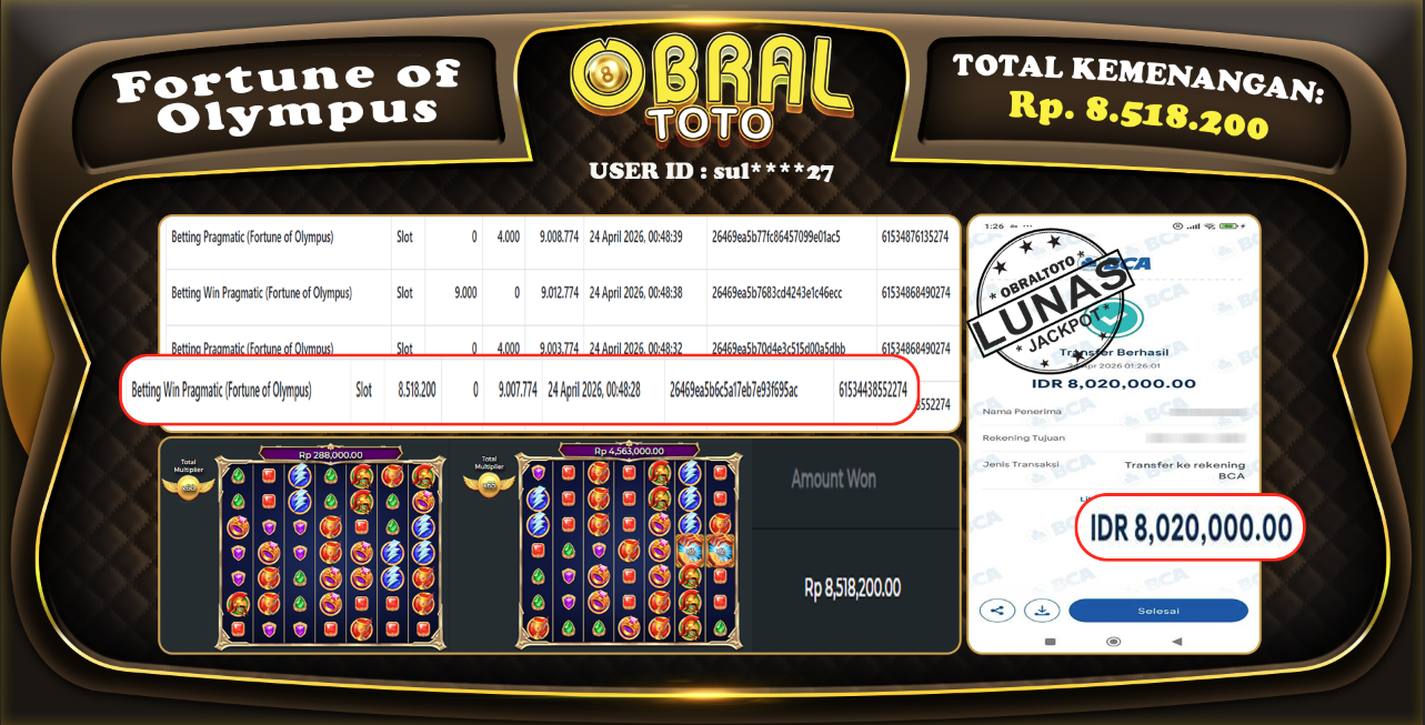 JACKPOT FORTUNE OF OLYMPUS Rp 8.518.200 Juta 25 APRIL 2026