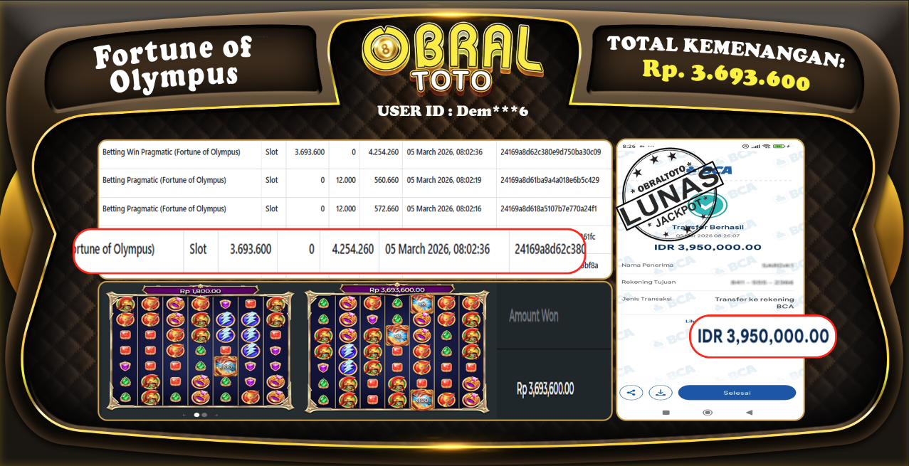 OBRALTOTO – Selamat Kepada Pemenang User id : Dem***6 JP FORTUNE OF OLYMPUS Rp3.693.600 Juta 05 MARET 2026- Situs game online terpercaya dengan bukti jp yang telah resmi dan terjamin di Indonesia, memberikan pengalaman bermain yang aman dan menyenangkan bagi para penggemar game online. Dengan hadirnya OBRALTOTO , pemain dapat menikmati kemudahan akses ke berbagai permainan seru, peluang memenangkan hadiah besar, serta keuntungan menarik yang telah disiapkan khusus untuk para member lama maupun member baru. Platform ini dirancang untuk memberikan kenyamanan dan keamanan, sehingga setiap pemain dapat fokus menikmati permainan sekaligus meraih keuntungan maksimal.