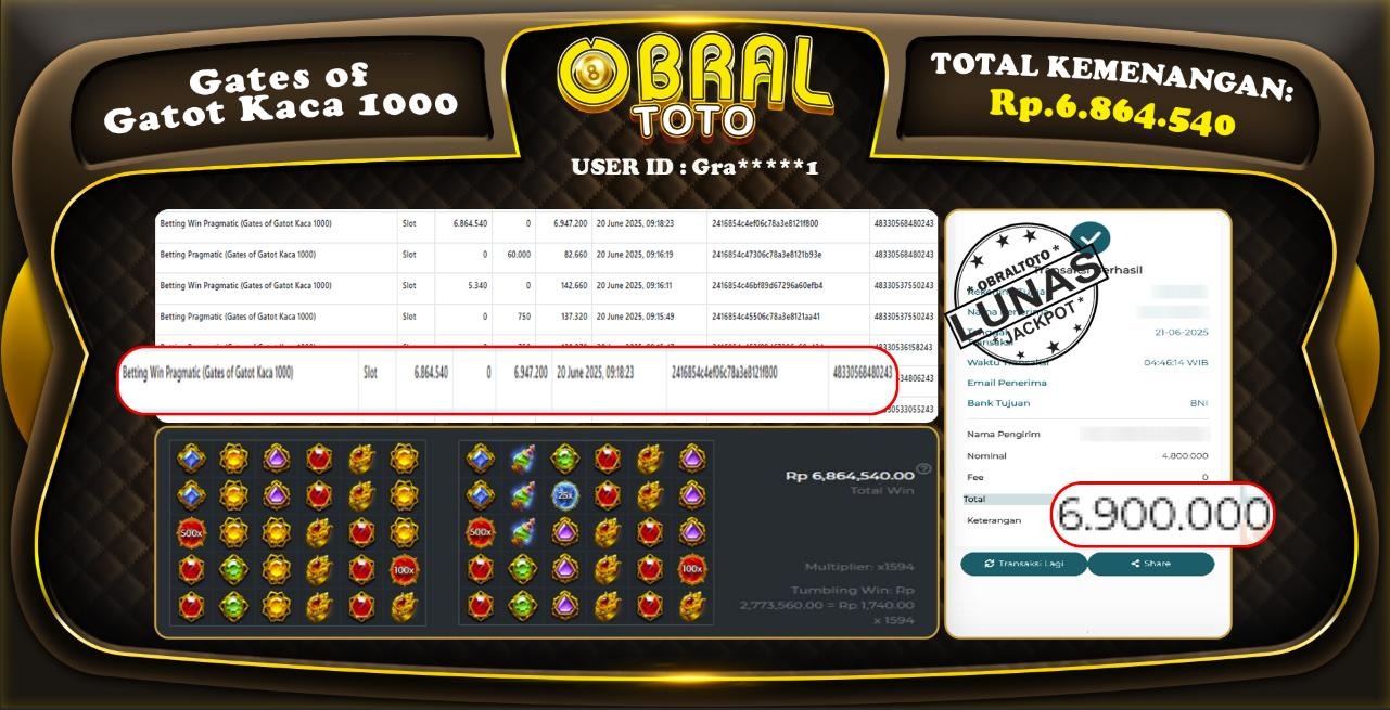 Kami merayakan selamat kepada salah satu pemain setia situs OBRALTOTO yang berhasil meraih kemenangan besar senilai Rp,6.864.540 dalam permainan GATES OF GATOKACA 1000 pada tanggal 24 JUNI 2025. Kemenangan ini telah kami proses dan pemahaman secara LUNAS ke rekening yang terdaftar. Semoga kemenangan ini menjadi motivasi bagi pemain lainnya untuk terus mencoba keberuntungan dan menikmati permainan di OBRALTOTO .