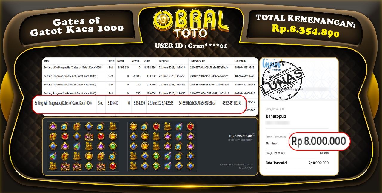 Kami merayakan selamat kepada salah satu pemain setia situs OBRALTOTO yang berhasil meraih kemenangan besar senilai Rp,8.354.890 dalam permainan GATES OF GATOKACA 1000 pada tanggal 22 JUNI 2025. Kemenangan ini telah kami proses dan pemahaman secara LUNAS ke rekening yang terdaftar. Semoga kemenangan ini menjadi motivasi bagi pemain lainnya untuk terus mencoba keberuntungan dan menikmati permainan di OBRALTOTO .