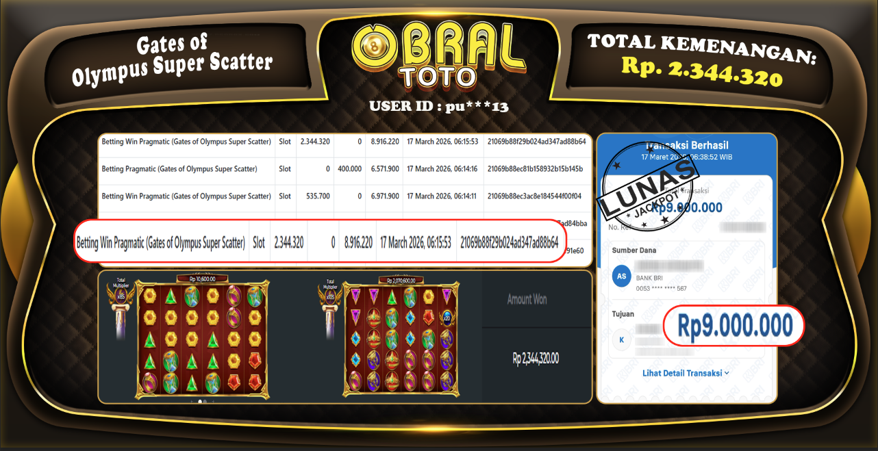Kami merayakan selamat kepada salah satu pemain setia situs OBRALTOTO yang berhasil meraih kemenangan besar senilai Rp, 2.344.320 dalam permainan GATES OF OLYMPUS 1000 pada tanggal 20 Maret 2026. Kemenangan ini telah kami proses dan pemahaman secara LUNAS ke rekening yang terdaftar. Semoga kemenangan ini menjadi motivasi bagi pemain lainnya untuk terus mencoba keberuntungan dan menikmati permainan di OBRALTOTO .