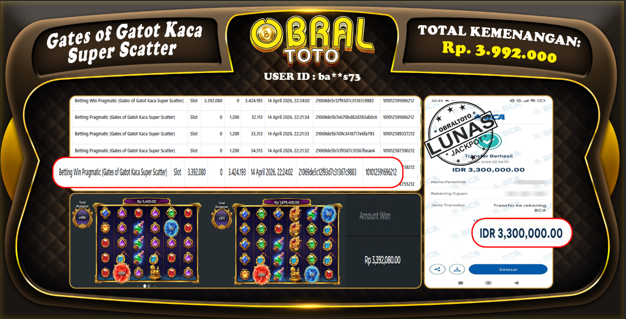OBRALTOTO – Selamat Kepada Pemenang User id : Ba**s73 JP Gates of Olympus 1000 Rp 3.992.000 – 16 APRIL 2026 – Situs game online terpercaya dengan bukti jp yang telah resmi dan terjamin di Indonesia, memberikan pengalaman bermain yang aman dan menyenangkan bagi para penggemar game online. Dengan hadirnya OBRALTOTO , pemain dapat menikmati kemudahan akses ke berbagai permainan seru, peluang memenangkan hadiah besar, serta keuntungan menarik yang telah disiapkan khusus untuk para member lama maupun member baru. Platform ini dirancang untuk memberikan kenyamanan dan keamanan, sehingga setiap pemain dapat fokus menikmati permainan sekaligus meraih keuntungan maksimal.