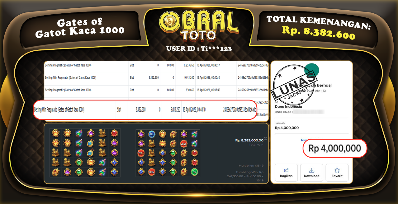 OBRALTOTO – Selamat Kepada Pemenang User id : Ti***123 JP Gates of Olympus 1000 Rp 8.382.600 – 20 APRIL 2026 – Situs game online terpercaya dengan bukti jp yang telah resmi dan terjamin di Indonesia, memberikan pengalaman bermain yang aman dan menyenangkan bagi para penggemar game online. Dengan hadirnya OBRALTOTO , pemain dapat menikmati kemudahan akses ke berbagai permainan seru, peluang memenangkan hadiah besar, serta keuntungan menarik yang telah disiapkan khusus untuk para member lama maupun member baru. Platform ini dirancang untuk memberikan kenyamanan dan keamanan, sehingga setiap pemain dapat fokus menikmati permainan sekaligus meraih keuntungan maksimal.