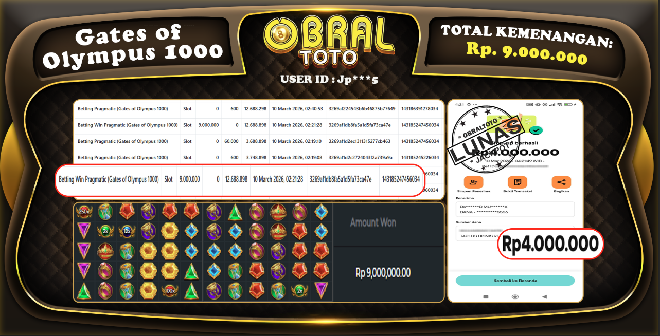 Kami merayakan selamat kepada salah satu pemain setia situs OBRALTOTO yang berhasil meraih kemenangan besar senilai Rp, 9.000.000 dalam permainan GATES OF OLYMPUS 1000  pada tanggal 10 Maret 2026. Kemenangan ini telah kami proses dan pemahaman secara LUNAS ke rekening yang terdaftar. Semoga kemenangan ini menjadi motivasi bagi pemain lainnya untuk terus mencoba keberuntungan dan menikmati permainan di OBRALTOTO .