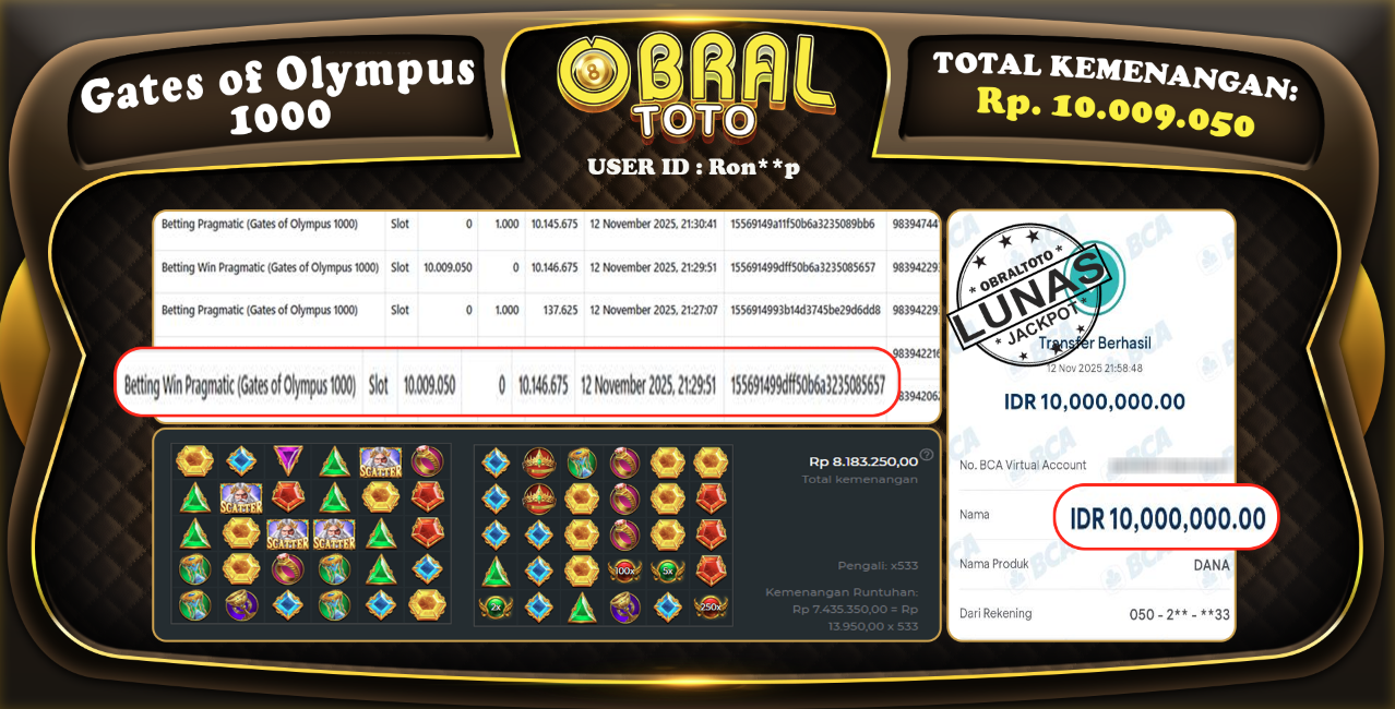 Kami merayakan selamat kepada salah satu pemain setia situs OBRALTOTO yang berhasil meraih kemenangan besar senilai Rp,15.009.050 dalam permainan GATES OF OLYMPUS 1000  pada tanggal 12 November 2025. Kemenangan ini telah kami proses dan pemahaman secara LUNAS ke rekening yang terdaftar. Semoga kemenangan ini menjadi motivasi bagi pemain lainnya untuk terus mencoba keberuntungan dan menikmati permainan di OBRALTOTO .