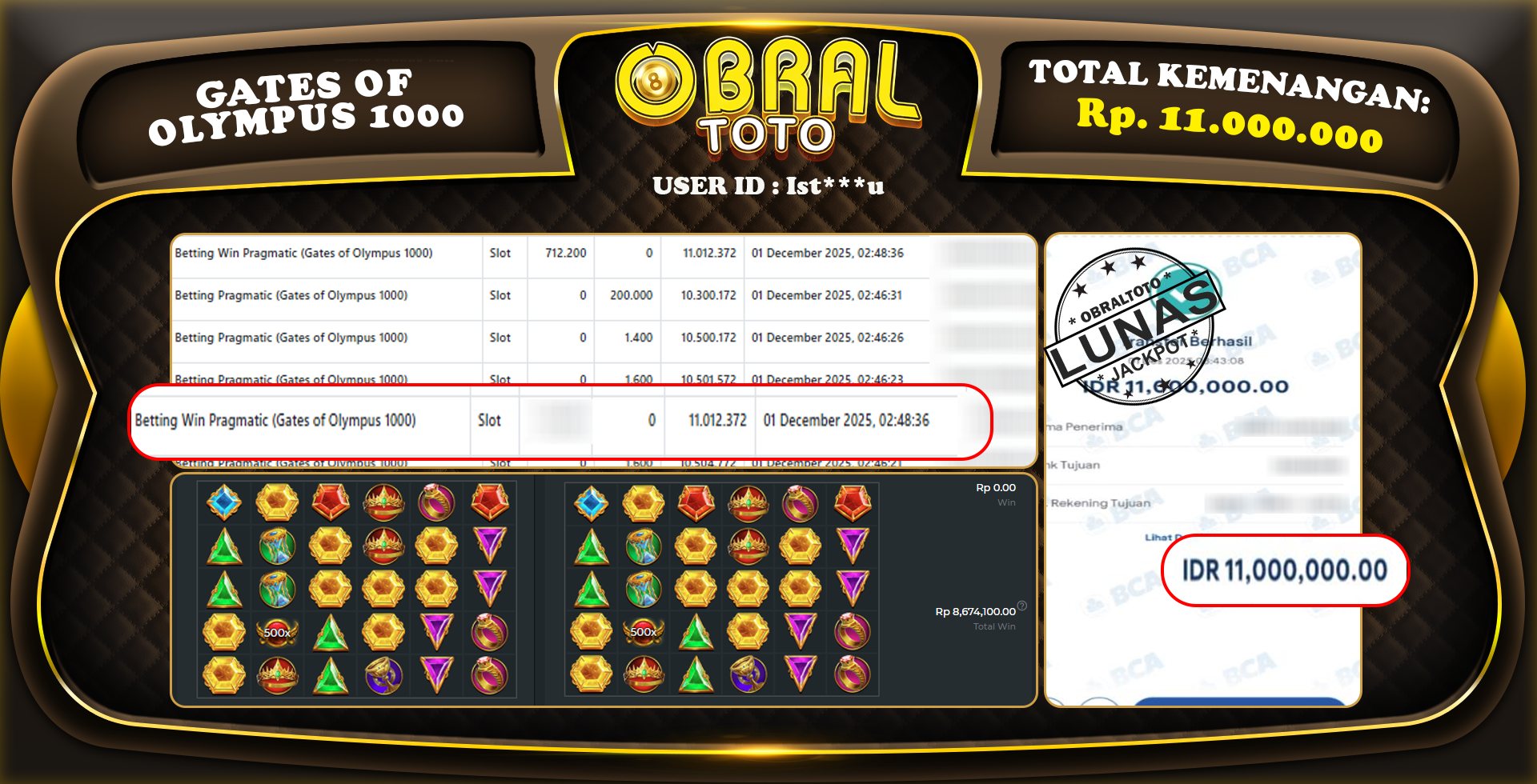 Kami merayakan selamat kepada salah satu pemain setia situs OBRALTOTO yang berhasil meraih kemenangan besar senilai Rp,11.000.000 dalam permainan GATES OF OLYMPUS 1000 pada tanggal 02 Desember 2025. Kemenangan ini telah kami proses dan pemahaman secara LUNAS ke rekening yang terdaftar. Semoga kemenangan ini menjadi motivasi bagi pemain lainnya untuk terus mencoba keberuntungan dan menikmati permainan di OBRALTOTO .