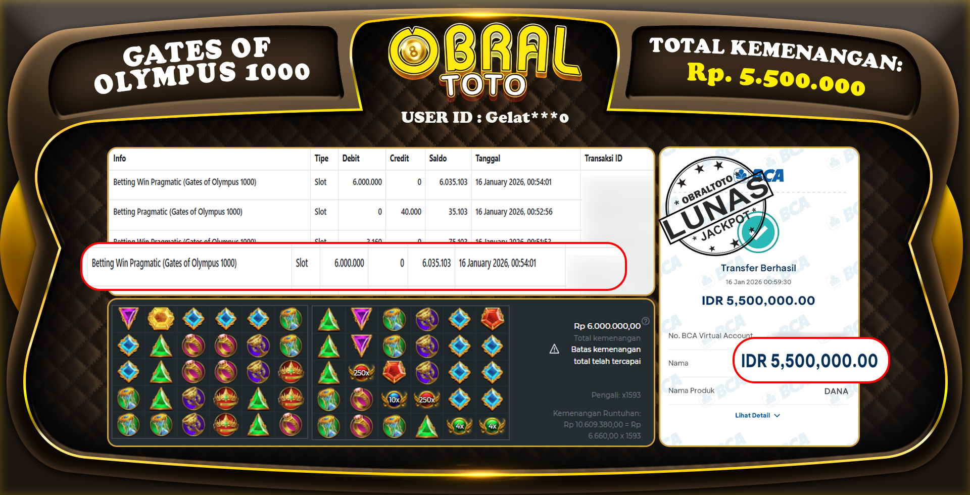 Kami merayakan selamat kepada salah satu pemain setia situs OBRALTOTO yang berhasil meraih kemenangan besar senilai Rp,5.500.000 dalam permainan GATES OF OLYMPUS 1000  pada tanggal 16 January 2026. Kemenangan ini telah kami proses dan pemahaman secara LUNAS ke rekening yang terdaftar. Semoga kemenangan ini menjadi motivasi bagi pemain lainnya untuk terus mencoba keberuntungan dan menikmati permainan di OBRALTOTO .