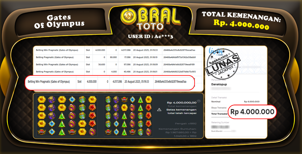 OBRALTOTO – Selamat Kepada Pemenang User id : Ac***3 JP GATES OF OLYMPUS 4.000.000 Juta 20 Agustus 2025 – Situs game online terpercaya dengan bukti jp yang telah resmi dan terjamin di Indonesia, memberikan pengalaman bermain yang aman dan menyenangkan bagi para penggemar game online. Dengan hadirnya OBRALTOTO , pemain dapat menikmati kemudahan akses ke berbagai permainan seru, peluang memenangkan hadiah besar, serta keuntungan menarik yang telah disiapkan khusus untuk para member lama maupun member baru. Platform ini dirancang untuk memberikan kenyamanan dan keamanan, sehingga setiap pemain dapat fokus menikmati permainan sekaligus meraih keuntungan maksimal.