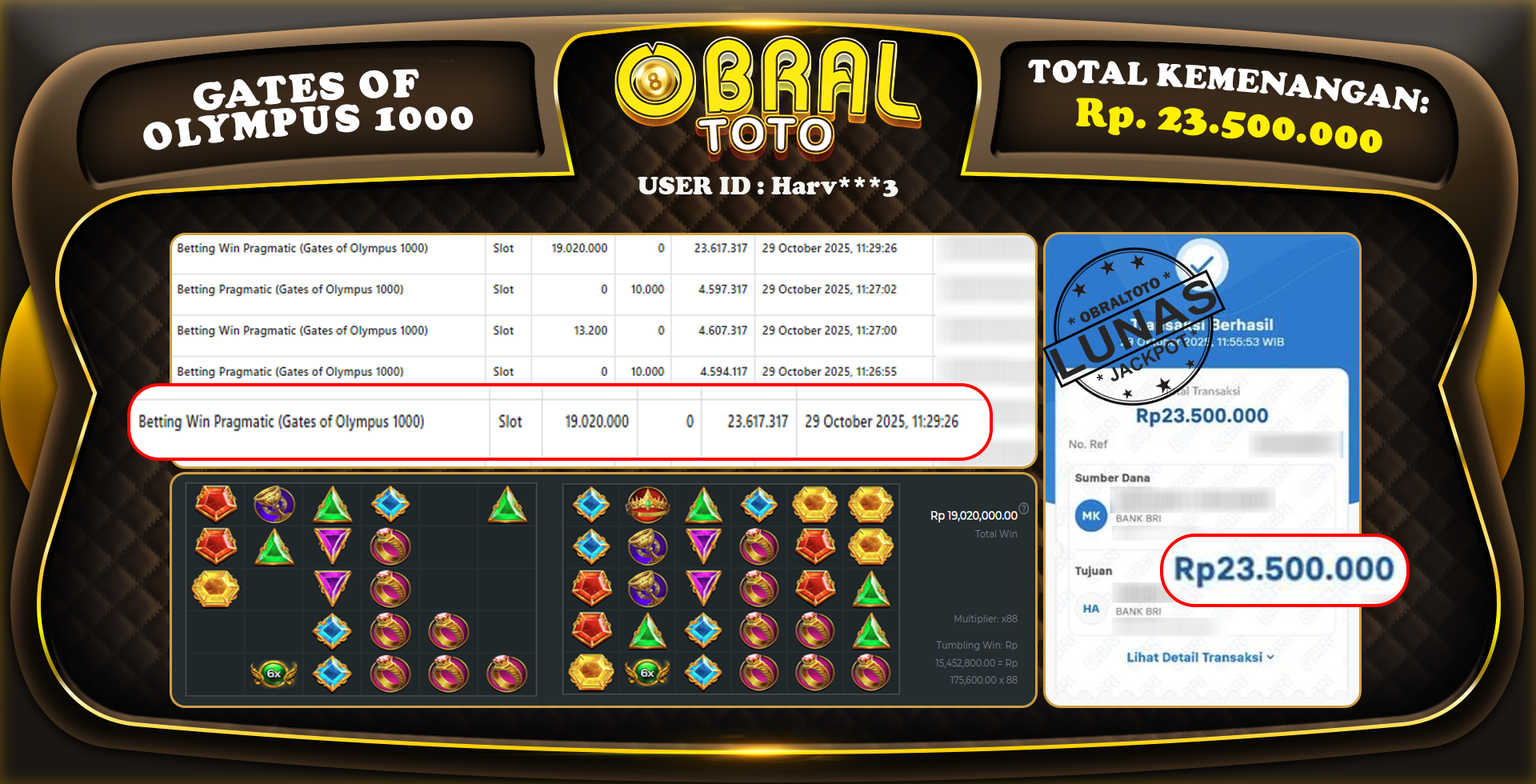 Kami merayakan selamat kepada salah satu pemain setia situs OBRALTOTO yang berhasil meraih kemenangan besar senilai Rp,23.500.000 dalam permainan GATES OF OLYMPUS pada tanggal 29 Oktober 2025. Kemenangan ini telah kami proses dan pemahaman secara LUNAS ke rekening yang terdaftar. Semoga kemenangan ini menjadi motivasi bagi pemain lainnya untuk terus mencoba keberuntungan dan menikmati permainan di OBRALTOTO .