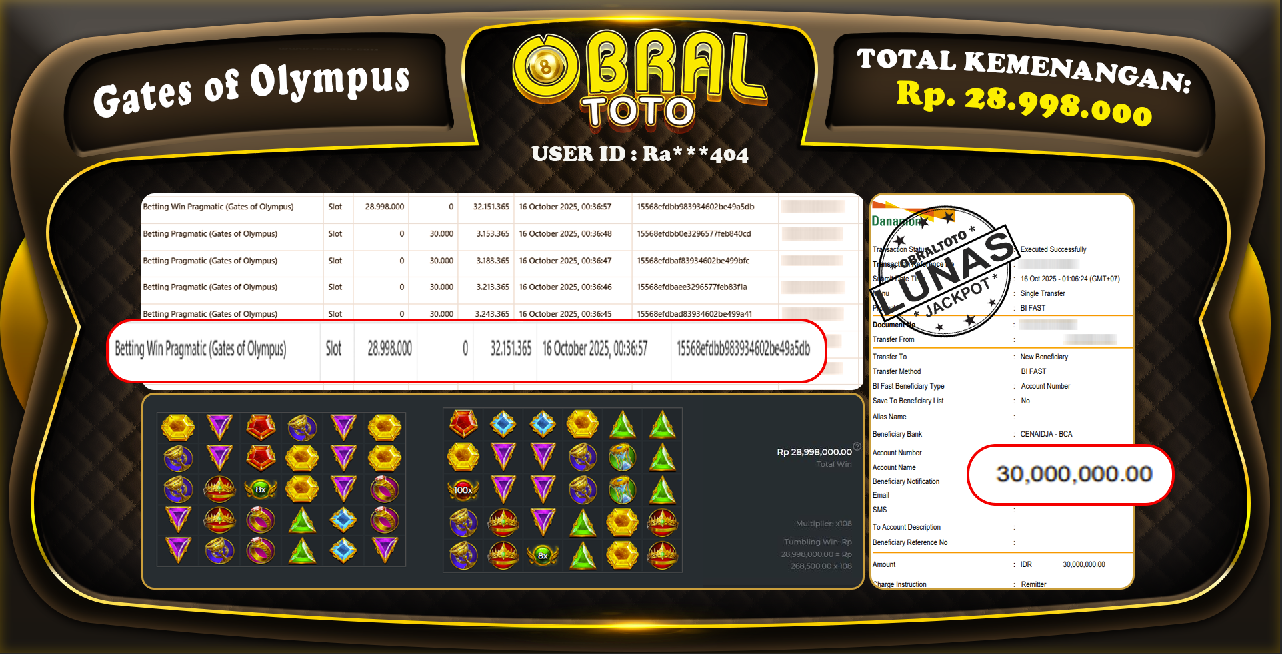 Kami merayakan selamat kepada salah satu pemain setia situs OBRALTOTO yang berhasil meraih kemenangan besar senilai Rp,28.998.000 dalam permainan GATES OF OLYMPUS pada tanggal 16 Oktober 2025. Kemenangan ini telah kami proses dan pemahaman secara LUNAS ke rekening yang terdaftar. Semoga kemenangan ini menjadi motivasi bagi pemain lainnya untuk terus mencoba keberuntungan dan menikmati permainan di OBRALTOTO .