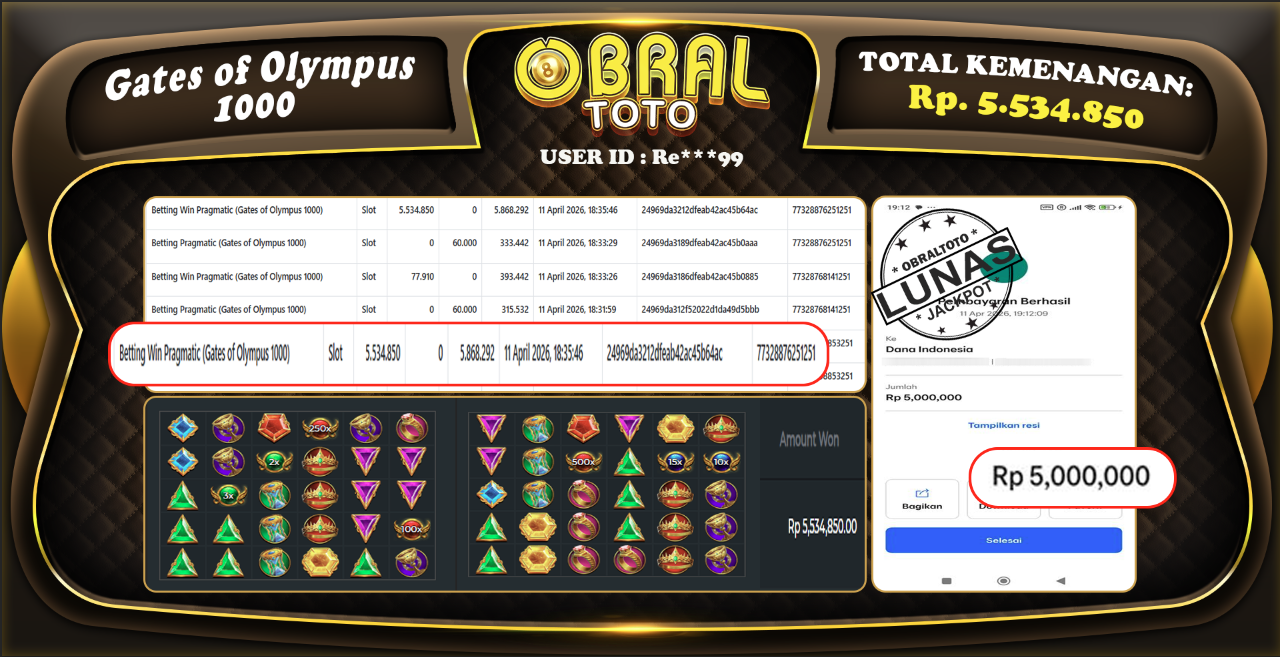 Bukti pembayaran lunas yang ditampilkan merupakan salah satu indikator bahwa situs OBRALTOTO adalah platform slot, togel, & casino yang sangat aman dan terpercaya. Dengan komitmen untuk membayar berapapun kemenangan yang diraih oleh para pemain, OBRALTOTO memastikan pengalaman bermain yang transparan dan memuaskan. Kepercayaan dan kenyamanan pemain adalah prioritas utama, sehingga setiap kemenangan Anda akan selalu dihargai dan dijamin secara penuh tanpa kendala.