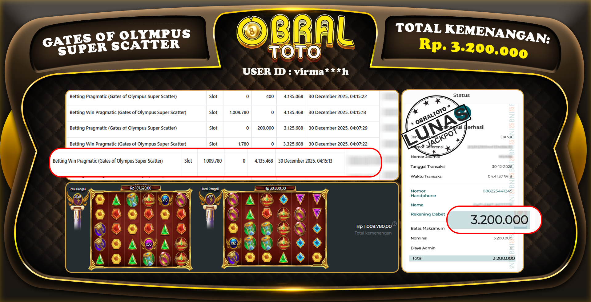 Kami merayakan selamat kepada salah satu pemain setia situs OBRALTOTO yang berhasil meraih kemenangan besar senilai Rp,3.200.000 dalam permainan GATES OF OLYMPUS SUPER SCATTER  pada tanggal 31 Desember 2025. Kemenangan ini telah kami proses dan pemahaman secara LUNAS ke rekening yang terdaftar. Semoga kemenangan ini menjadi motivasi bagi pemain lainnya untuk terus mencoba keberuntungan dan menikmati permainan di OBRALTOTO .