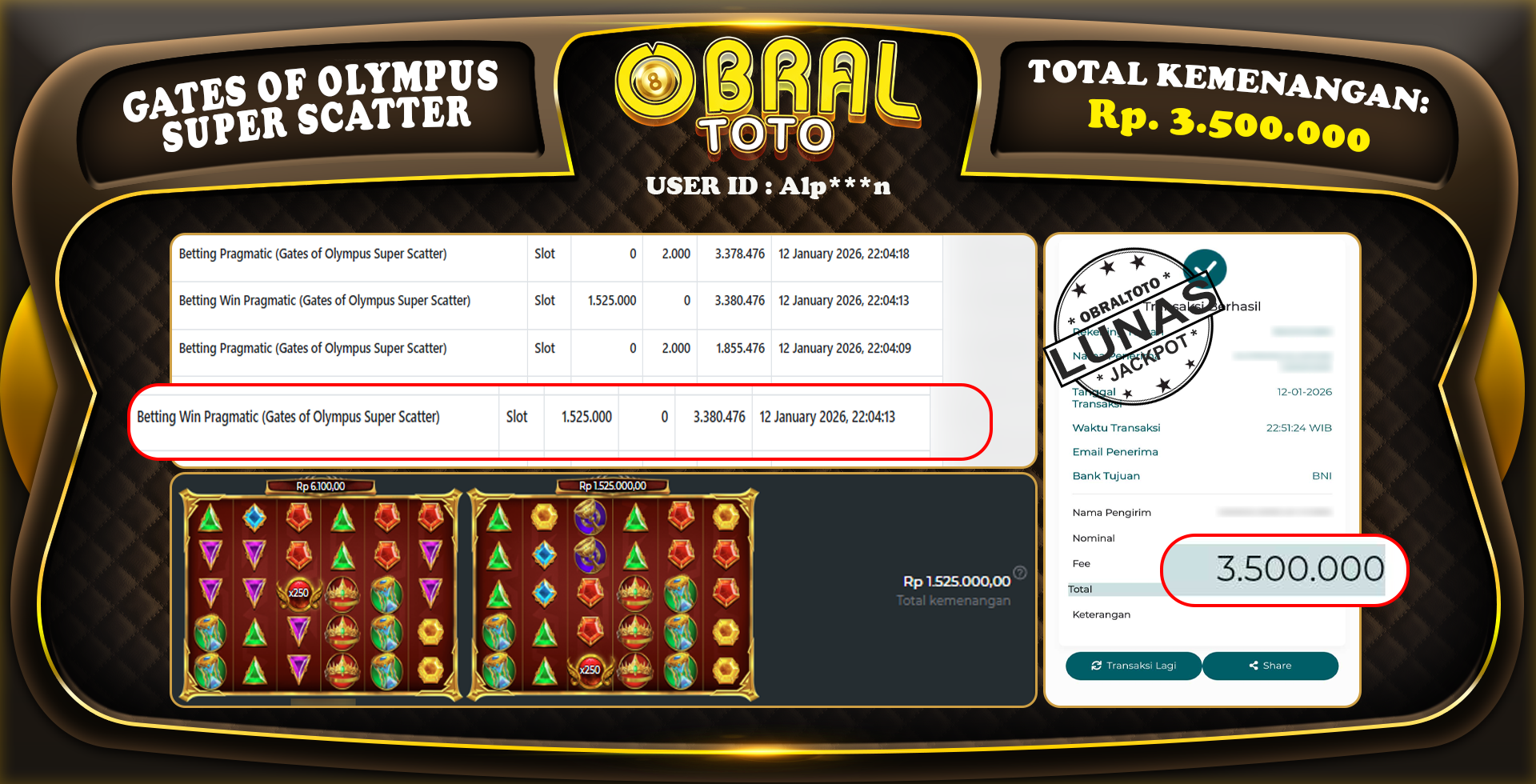 Bukti pembayaran lunas yang ditampilkan merupakan salah satu indikator bahwa situs OBRALTOTO adalah platform slot, togel, & casino yang sangat aman dan terpercaya. Dengan komitmen untuk membayar berapapun kemenangan yang diraih oleh para pemain, OBRALTOTO memastikan pengalaman bermain yang transparan dan memuaskan. Kepercayaan dan kenyamanan pemain adalah prioritas utama, sehingga setiap kemenangan Anda akan selalu dihargai dan dijamin secara penuh tanpa kendala.