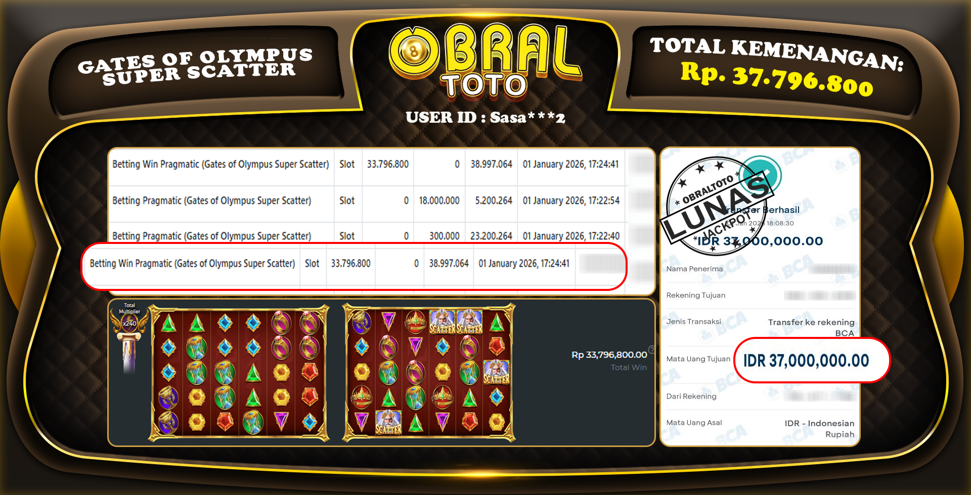 Kami merayakan selamat kepada salah satu pemain setia situs OBRALTOTO yang berhasil meraih kemenangan besar senilai Rp,37.796.800 dalam permainan GATES OF OLYMPUS SUPER SCATTER  pada tanggal 02 January 2026. Kemenangan ini telah kami proses dan pemahaman secara LUNAS ke rekening yang terdaftar. Semoga kemenangan ini menjadi motivasi bagi pemain lainnya untuk terus mencoba keberuntungan dan menikmati permainan di OBRALTOTO .