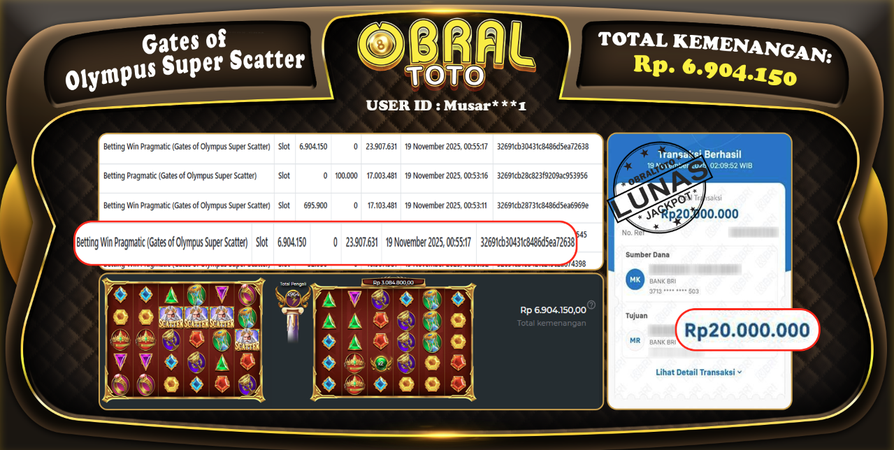 Kami merayakan selamat kepada salah satu pemain setia situs OBRALTOTO yang berhasil meraih kemenangan besar senilai Rp,6.904.150 dalam permainan GATES OF OLYMPUS SUPER SCATTER pada tanggal 19 November 2025. Kemenangan ini telah kami proses dan pemahaman secara LUNAS ke rekening yang terdaftar. Semoga kemenangan ini menjadi motivasi bagi pemain lainnya untuk terus mencoba keberuntungan dan menikmati permainan di OBRALTOTO .