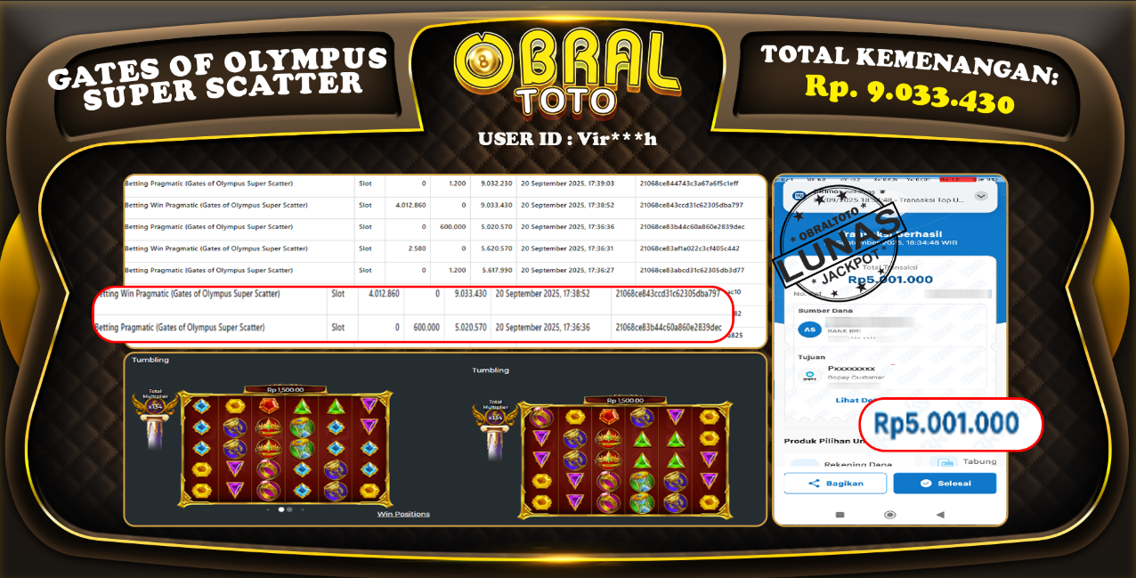 Kami merayakan selamat kepada salah satu pemain setia situs OBRALTOTO yang berhasil meraih kemenangan besar senilai Rp,9.033.430 dalam permainan GATES OF OLYMPUS SUPER SCATTER pada tanggal 20 September 2025. Kemenangan ini telah kami proses dan pemahaman secara LUNAS ke rekening yang terdaftar. Semoga kemenangan ini menjadi motivasi bagi pemain lainnya untuk terus mencoba keberuntungan dan menikmati permainan di OBRALTOTO .